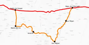 This is a segment planned since 1973, but construction started until 2013 and was opened in August 2017, it directly connects the then two endpoints of Route 4, at Bajos de Chilamate in Heredia province and Vuelta de Kooper in Alajuela province with a road of 27 km, single lane in each direction, and avoids the previous longer journey of 87.32 km which went through Route 126, Route 140, Route 250 and Route 751, and the towns of La Virgen, San Miguel, Venecia and Aguas Zarcas. This last segment finally concludes the construction of the originally planned Route 4.[3]