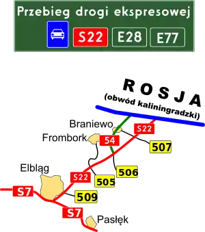 National road 54 (Polish: Droga krajowa nr 54) is a route belonging to the Polish national road network. The highway is a GP-class road,[1] 18 km (11 mi) long, located in the Warmian-Masurian Voivodeship. This route connects the Expressway S22 at the Braniewo-Południe junction near Chruściel with the Gronowo-Mamonovo border crossing near Russia.