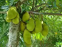 The jackfruit (Artocarpus heterophyllus) is the national fruit of Bangladesh. It is native to parts of South and Southeast Asia and widely cultivated in tropical regions of Bangladesh. The jackfruit tree is well suited to tropical lowlands, and its fruit is the largest tree-borne fruit,[16] reaching as much as 80 pounds (36 kg) in weight, 36 inches (90 cm) in length, and 20 inches (50 cm) in diameter.[17] |