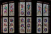 The English Classroom is designed in the Tudor-Gothic style after the House of Commons that was rebuilt by Sir Charles Barry following the fire of 1834. The English Classroom is the largest of the Nationality Rooms and incorporates several original items given as gifts from the British Government from the damaged House of Commons, whose Chamber was completely destroyed, following its bombing by the Luftwaffe in 1941, including the stone fireplace, hearth tiles, linenfold oak paneling, entrance doorframe, lintel, and corbels. The fireplace is from the Commons' "Aye Lobby", so named because members walk through it to vote "yes" to a bill, and is marked with the initials V.R. for Victoria Regina. The cast-iron fireback and andirons commemorate the defeat of the Spanish Armada in 1588 and an inscription above the fireplace is from Shakespeare's King Richard II and uses lettering adapted from the letter tiles originally designed for medieval paving by the Monks of Chertsey Abbey in Surrey. The inscription reads: "Set in the silver sea.....this blessed plot, this earth, this realm, this England." Above the doorway hangs a royal coat of arms made in 1688 during the reign of King James II. The linenfold paneling itself arrived at the University still having a blackened coat from the bombing.[27] Under the ceiling trusses are four carved limestone corbels from the House of Commons that are carved with a Tudor rose. Two corbels remain uncarved to emphasize the original carved corbels. The window frames, set in limestone, are characteristic of the Tudor period, and contain old imported glass, seeded and tinted, and encased in small, diamond-shaped leaded frames. Stained-glass window medallions depict the coats of arms of English towns and cities, literary and political figures, scholars of the Universities of Cambridge and Oxford, and the Houses of Lords and Commons. Portraits of University of Pittsburgh alumnus and former Ambassador to the Court of St. James's, Andrew Mellon, and the former Earl of Chatham, William Pitt, after whom the City was named, flank the stained glass windows in the rear bay. A brick from 10 Downing Street serves as the room's cornerstone. The white oak floor is fitted together with wooden peg dowels. Tudor-Gothic oak benches resemble the old House of Commons benches and are similarly arranged. Two English oak tables with melon-shaped legs stand before the bay. Two House of Commons Library chairs upholstered in green leather and bearing the official gold crest featuring the portcullis and crown were a gift of Lord Alfred Bossom and were rebuilt using wood from actual chairs in the bombed House of Commons.[28][29]