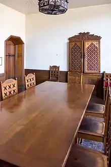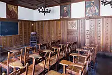 The German Classroom was designed by German-born architect Frank A. Linder to reflect the 16th century German Renaissance as exemplified in the Alte Aula (Great Hall) of the University of Heidelberg. The woodwork of the room was done by German-born Philadelphia decorator Gustav Ketterer and includes walnut paneling framing the blackboards, columns carved with arabesques flanking the two entrance doorways, and support broken-arch pediments surmounted by carved polychromed crests of the two oldest German universities: Heidelberg (1386) and Leipzig (1409). The doors are mounted with ornate wrought-iron hinges and locks, and their upper panels are decorated with intarsia depicting the central square of Nürnberg on the front door and the fountain of Rothenburg on the rear door. Carved in the architrave above the paneling are the names of famous philosophers, poets, musicians, artists, and scientists. The intarsia doors of the four corner cabinets feature tales from German folklore including Parsifal who searched for the Holy Grail, Siegfried who was the hero of the Nibelungenlied, the maiden wooed in Goethe's poem Heidenröslein, and Lorelei who was the golden-haired Rhine maiden whose song lured sailors to destruction. Painted on the escutcheon above the front blackboard are words from Friedrich Schiller's Das Ideal und das Leben, "Stern endeavor, which no arduous task can shake, to the hidden fount of true attains." The rear wall has a quotation from Johann Wolfgang von Goethe's Was wir bringen which reads: "Great mastery results from wise restraint, and law alone points the way to liberty." Furniture includes the professor's leather upholstered chair stands on a small platform behind a burled walnut table and student tablet armchairs are walnut with scroll backs. Wrought-iron chandeliers are the work of German craftsman. The display case contains gifts of artworks and books from Germany's Ministry of Education. The stained-glass windows were designed by master stained glass artist Charles Connick, however they were not completed until 1953 by Connick protege Frances Van Arsdale Skinner.[24] The windows depict characters in the Grimm Brothers' fairy tales such as Little Red Riding Hood, Snow White and the Seven Dwarfs, Hansel and Gretel, and Cinderella.[31]