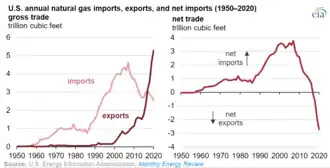 In 2017, the United States became a net exporter of natural gas on an annual basis for the first time since 1957. Net exports averaged 0.4 billion cubic feet per day. The US Energy Information Administration projected that net exports would grow to 4.6 billion cubic feet per day in 2019.[44] Export growth was driven by pipeline exports to Mexico and Canada, although the US continued to import more from Canada than it exports to that country. In addition, exports of liquefied natural gas increased.[45]