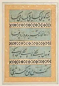 ![]() Portrait of Naubat Khan Kalawant by Ustad Mansur, Mughal School ca. 1600, British Museum, London.[1] | |