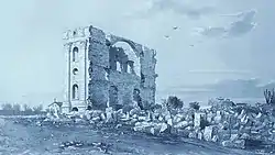 After the fire of October 9, 1848, only the four exterior walls remained standing.[7] The Icarian leader Cabet was fascinated by the temple and planned to reconstruct it, and a considerable amount of money was spent in the endeavor. However, on May 27, 1850, Nauvoo was struck by a major tornado which toppled one of the walls of the temple. One source claimed the storm seemed to "single out the Temple", felling "the walls with a roar that was heard miles away".[8] Cabet ordered the demolition of two more walls in the interests of public safety, leaving only the façade standing. The Icarians used much of the temple's stone to build a new school building on the southwest corner of the temple lot. By 1857, however, most of Cabet's followers had left Nauvoo and over time many of the original stones for the temple were used in the construction of other buildings throughout Hancock County. In February 1865, Nauvoo's City Council ordered the final demolition of the last standing portion of the temple—one lone corner of the façade. Soon afterwards, all evidence of the temple disappeared, except for a hand pump over a well that supplied water to the baptismal font.[5] Three of the original sunstones are known to have survived and are on display—one is on loan to LDS Church's Visitor Center in Nauvoo, one is in the Smithsonian Institution in Washington, D.C, and the third and only one that has not been restored is displayed, along with the only moonstone on display, at the Joseph Smith Historic Center of the Community of Christ.