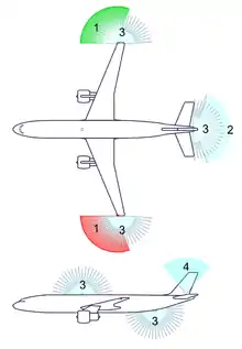 Aircraft navigation lights follow the convention of marine vessels established a half-century earlier, with a red navigation light located on the left wingtip leading edge and a green light on the right wingtip leading edge. A white navigation light is as far aft as possible on the tail or each wing tip.[6] High-intensity strobe lights are located on the aircraft to aid in collision avoidance.[7] Anti-collision lights are flashing lights on the top and bottom of the fuselage, wingtips and tail tip. Their purpose is to alert others when something is happening that ground crew and other aircraft need to be aware of, such as running engines or entering active runways.