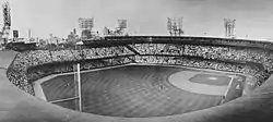 When the park was expanded in 1936, a second deck was added over the right field pavilion and bleachers. To fit as many seats as possible in the expansion, the second deck was extended over the fence by 10 feet (3 m). The overhang would occasionally turn some extremely high arced fly balls into home runs.[3] Spotlights were added above the warning track to illuminate the area beneath the overhang.[6]