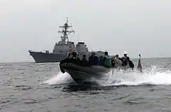 Since 2004, the Navy's deployment took place in Indian Ocean, playing a crucial role in the multinational NAVCENT in Bahrain, and took the leadership of the CTF-150 and CTF-151 as well as taking active participation in the Operation Enduring Freedom in 2006–10.[81][82][83] In 2008, the task force group consisting of PNS Badr, PNS Shah Jahan, PNS Nasr, and the Pakistan Air Force's Explosive Ordnance Disposal participated in the Exercise Inspired Union with the U.S. Navy in the Indian Ocean to develop skills in a prevention of seaborne terrorism.[84]
