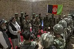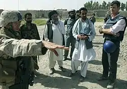 In 2009 the Taliban began moving even more men into Nawa, possibly for additional attacks against Lashkar Gah. On May 13, they launched an attack against the Afghan National Police in the district, that overwhelmed several posts. By late spring they had established a solid foothold in the district.[12] On July 2, 2009, Marines from the 1st Battalion, 5th Marines (1/5) occupied the district as part of Operation Strike of the Sword. They set up their headquarters in Forward Operating Base Geronimo. On August 26, Lance Corporal Donald Hogan, a Marine with 1/5, threw himself in front of an improvised explosive device (IED), saving the Marines in his squad. He was later posthumously awarded the Navy Cross for his actions.[13] In December, 1/5 was replaced by 1st Battalion, 3rd Marines.[14][15] In the late summer and early fall the Marines detained Haji Adam, one of Nawa's main drug lords, and turned his house into Combat Outpost (COP) Sullivan.[16] In November two local officials were assassinated.[17] On December 17, Admiral Mike Mullen, the Chairman of the Joint Chiefs of Staff, visited Patrol Base Jaker and touted the security gains by touring the Nawa district center without wearing body armor.[18] Several weeks later Afghan President Hamid Karzai and ISAF commander General Stanley McChrystal also visited Nawa on January 2, 2010.[2] On January 9 British journalist Rupert Hamer and two Marines were killed by an IED in the district.[19]