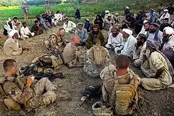 In 1978 the People's Democratic Party of Afghanistan seized control of the government and began a program of rapid modernization. Among the many institutions they targeted were the local landlords, known as the khans. In Helmand Province groups of local warlords and armed resistance fighters quickly rose in opposition to the government and filled the power vacuum left by the khans. Most resistance in Helmand was carried out on tribal lines; without a significant tribal base, Nawa-i-Barakzayi became a major government stronghold. During the Soviet occupation, the Afghan Communists recruited many of their Khalq militia from Nawa-i-Barakzayi.[5] The Russians also had a major operations base near Lashkar Gah with at least 2500 soldiers, including the 22nd Spetznaz Brigade.[6] The main Russian strategy in central Helmand was to cut a deal with the main mujahideen commander, Mullah Mohammad Nasim Akhundzada which divided the province into the Soviet areas (Lashkar Gah and Gereshk) and the mujahideen areas (everywhere else).[7] After repeatedly taking indirect fire from mujahideen units operating in the Nawa area, the Soviets launched a clearing operation there in 1987 and set up a Sarandoy (Armed Police) Battalion.[6] According to the local residents, over 20% of their homes were destroyed during the Soviet occupation.[8]