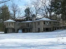 The single-story ranch house, built from stone and concrete, shows Prairie School influence in the way it was incorporated into its location alongside the Iowa River. Both the main and lower levels of the house provided excellent views of the river.[2]