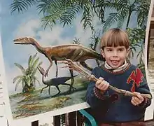 | Six year-old Justin Hofmann holding the hindlimb of his namesake dinosaur, Nedcolbertia justinhofmanni. | |