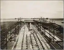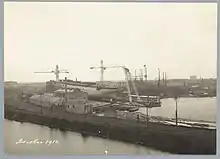 On the day of the opening the new shipyard started its activity with the construction of a new floating drydock using two of the slipways at the same time. It was ordered by the ADM and measured 650' by 130' and had a hold of 56? feet.[41] Mr. Goedkoop, CEO of NSM noted that it was a bit weird to open a new shipyard while many were closing down. He noted that the situation of the shipbuilders had never been so desperate. Global tonnage was way above what was needed. Many ships had been laid up, and many of those still sailing did so at a loss. Shipping lines ordered almost nothing, and competition was so fierce that only very well established companies made a chance to get orders that did not result in a loss, or resulted in only a very limited loss. All this made that there was little reason for festivities, especially because there was no end in sight for the problems. Goedkoop thought the NSM to be able to withstand the crisis. It had an old shipyard that was well equipped, and written off financially. The new shipyard was very well equipped, and therefore also had a low cost structure. NSM also had competent staff and laborers. However, the shareholders, staff and laborers, from the board till the lowest apprentice should realize they would have to be satisfied with somewhat less than before.[41] Indeed NSM increased its number of employees by 50% in the second half of 1922, but it also lowered its dividend over 1922 to 5% even while it had enough work.[42]