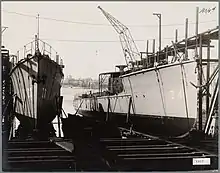 After the war, the total damage to the shipyard was estimated at 3,800,000 guilders.[70] During the war, the fifth slipway had been completed. The quay that was used for finishing ships was expected to be operational by October 1945. A new crane that had been hidden during the war, and some repaired cranes would enable the shipyard to build some 4,000 ton ships within a few months. It was expected that by fall 1946, all slipways would be operational again.[71] By January 1946, three overhead cranes were operational again. In January, the NSM also received an order for two tankers from Norway, which would be completely welded. In February, an order for two freighters for the Vereenigde Nederlandsche Scheepvaartmaatschappij followed.