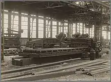 On 6 October 1922 the new shipyard on the north side of the IJ was opened. Many of the workshops were in a main building of 140 by 125 m with overhead cranes and many modern machines. There was a drill machine that made up to 32 holes at a time, with the sheet metal moving automatically to the next position for the holes to be drilled. There were also very heavy metal cutting machines. In an engine house there were machines to transform the electricity from the municipal grid to the kind required to drive power tools, all machines being driven electrically. There were three concrete slipways of 190 m long and 22.5 m wide situated in parallel. The lower end of these slipways was below the waterline and closed of by doors, so ships could easily be launched by letting water onto the slipway.[41]