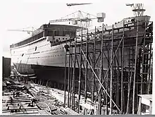 In 1938, the NSM finally had a normal year from a financial perspective. The result allowed a depreciation of 251,463 guilders, and a (real) profit of 133,988 guilders, which allowed a dividend of 5%.[67] 1938 was also memorable for the launch of MS Oranje of 205 m and 20,017 Grt. In 1939, the operational result of the NSM almost doubled, and the company decided to build a fifth slipway. In the shareholders meeting of 25 April 1940, the board stated that this fifth slipway had a direct relation with the expected construction of battle cruisers, cf. the Design 1047 battlecruiser.[68] Of the result of 683,555 guilders, most went to depreciation, in part to pay for a switch to electric welding. From the net profit of 133,990, a dividend of 5% was paid.[69]