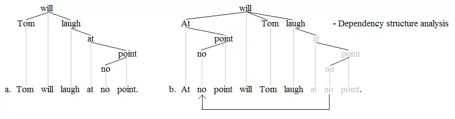 Like many types of inversion, negative inversion challenges theories of sentence structure. The challenge is because of the fronting of the phrase containing the negation. The phrase is separated from its governor in the linear order of words so a discontinuity is perceived. The discontinuity is present regardless of whether one assumes a constituency-based theory of syntax (phrase structure grammar) or a dependency-based one (dependency grammar). The following trees illustrate how this discontinuity is addressed in some phrase structure grammars:[4]