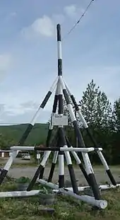 The "tripod", which actually has four supports, is planted on the river ice between the highway and railroad bridges in Nenana, 300 ft from the shore. The tripod is connected to a clock which stops as the ice goes out, moving the tripod with it. The Nenana Ice Classic annual festival is the time that the tripod is erected on the ice of the frozen Tanana River. The tripod parts are built and painted prior to the festival sourcing local timber and enlisting community members. Using a chainsaw, a trough is carved into the river ice which is usually around three feet thick at that time of year. The base of the tripod is lowered into the trough. An auger is implemented to bore a hole further into the ice until the river water is released, flooding the trough. This will freeze the tripod securely to the frozen river. As a high point during the festival the community gathers together and using ropes attached to the tripod uprights they work together to lift the uprights into place. The uprights are then secured to each other. A line is attached to the top of the tripod and once that end is anchored the other end is taken to the Ice Classic tower nearby on the banks of the river. Attached there to the clock inside the tower, when the ice goes out and moves the tripod 100 feet the line breaks and stops the clock.
