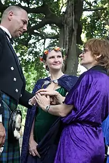 The Civil Union Act, which came into effect on 30 November 2006, legalised same-sex marriage and also allowed for the legal designation of religious marriage officers without any religious restriction in accordance with the Constitution. Previously, religious marriage officers could only be legally designated as such "for the purpose of solemnizing marriages according to Christian, Jewish or Mohammedan rites or the rites of any Indian religion" in accordance with the Marriage Act. A Pagan wedding ceremony, also referred to as a handfasting, performed by someone other than a legally designated marriage officer could be legalised in a second civil ceremony although this option was restricted to opposite-sex couples prior to the implementation of the Civil Union Act.[1][22]