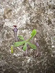 Upper pitchers are typically somewhat infundibular in the lowermost part, becoming narrowly ovoid in the lower third, and finally cylindrical and slightly narrower above. They may be quite large, reaching 25 cm in height by 5 cm in width.[5] The waxy zone of the inner surface is well developed.[8] A pair of remnant ribs is present in place of the ventral wings.[5] The inner portion of the peristome accounts for around 40% of its total cross-sectional surface length.[8] Other parts of aerial pitchers are similar to their lower counterparts.[5]