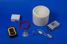 The NNS operates under the same principle as a Bonner sphere neutron spectrometer.[2] The sensitive part of the spectrometer is the Helium-3 proportional counter, which detects neutrons through the reaction 3He(n,p)3H. This particular reaction has a significant cross-section only at thermal neutron energies. In order for a higher energy neutrons to be detected their energies must be decreased, or "moderated". To slow down neutrons at higher energies the NNS uses different amounts of high-density polyethylene (HDPE). The He-3 proportional counter is surrounded by varying amounts of HDPE to sample various energy regions of the neutron field. The standard NNS has seven HDPE cylinders which are nested together, similar to Russian nesting dolls, to measure neutrons of higher and higher energies.