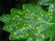 The common spangle gall on the underside of leaves and the currant gall on the male catkins or occasionally the leaves, develop as chemically induced distortions on pedunculate oak (Quercus robur), or sessile oak (Quercus petraea) trees, caused by the cynipid wasp[1] Neuroterus quercusbaccarum which has both agamic and bisexual generations.