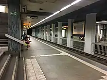 The station was opened in 1974 and consists of an elevated and an underground station, each with two side platforms and two rail tracks.
