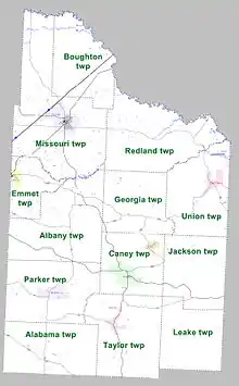 Townships in Arkansas are the divisions of a county. Each township includes unincorporated areas; some may have incorporated cities or towns within part of their boundaries. Arkansas townships have limited purposes in modern times. However, the United States census does list Arkansas population based on townships (sometimes referred to as "county subdivisions" or "minor civil divisions"). Townships are also of value for historical purposes in terms of genealogical research. Each town or city is within one or more townships in an Arkansas county based on census maps and publications. The townships of Nevada County are listed below; listed in parentheses are the cities, towns, and/or census-designated places that are fully or partially inside the township. [15][16]