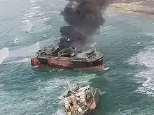 Since the vessel was no longer seaworthy and could not move under its own power, even if freed from the beach, the focus of the operation changed. Oil from the ship's fuel tanks continued to pose an environmental hazard, a situation exacerbated by both the ship's structural failure and continuing pounding from the surf. In order to mitigate the situation, the Unified Command decided to set the fuel tanks on fire in order to burn off the oil. The first attempt was made on 10 February. Napalm and other incendiary devices were used to ignite the fuel, but only one of the diesel tanks was burned effectively. A second attempt was made on 11 February when US Navy explosive experts placed 39 shaped charges to breach the top of the fuel tanks from within the cargo holds. 602 U.S. gallons (2,280 L) of napalm and nearly 397 pounds (180 kg) of plastic explosives were also used to ignite the fuel on board. The ship burned for approximately 33 hours.[8] Additional smaller-scale attempts were made to burn more oil over the next two days, with limited success. The total amount of oil that was burned is estimated to be between 165,000 and 255,000 US gallons (620 and 970 m3).[8] The structural stress caused by the fire, combined with continued severe weather, caused the vessel to break into two sections around midnight on 11 February.