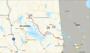 | Wolfeboro | 15.232 | 24.514 | Southern end of wrong-way concurrency with NH 28 | ||