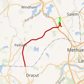 The state route begins at the Massachusetts state line within the town of Pelham, Hillsborough County. After passing through the reaches of a quarry, most of which is in Massachusetts, it travels north along Bridge Street passing numerous businesses, but otherwise traveling to the east of the center of town. At Main Street, it begins to bend to the northeast, passing under a power line corridor, and then heads through a residential neighborhood. It crosses into Salem, Rockingham County where the highway name changes to Lowell Road. Through Salem, NH 38 crosses another residential neighborhood before it heads past more commercial properties. The road passes under I-93 before it curves to the north to head along the west side of the Mall at Rockingham Park and its name changes to Pleasant Street.[1]
