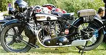 After WW1 they resumed motorcycle manufacture, but only with the single cylinder 2-stroke which they had originally introduced in 1914.[8] Their adverts claimed it was "constructed throughout, including engine and gearbox, in the New Hudson works". A racing version of the 2-stroke was introduced for 1921, capable of 50 mph.[9] At the 1921 Olympia show New Hudson unveiled their first 4-stroke since the war, a 4.5HP single cylinder sidecar outfit. The side-valve engine had a bore of 86mm and stroke of 100mm giving 594cc. The following year new side-valve 346cc and 498cc solo motorcycles were added to the range.[10]