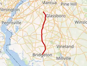Route 77 is a state highway in the southern part of the U.S. state of New Jersey. It runs 22.55 mi (36.29 km) from an intersection with Route 49 in Bridgeton, Cumberland County north to a junction with Route 45 in Mullica Hill, Gloucester County. It is a mostly two-lane, undivided road traversing through farmland in Cumberland, Salem, and Gloucester Counties. Along the way, Route 77 intersects Route 56 in Upper Deerfield Township and U.S. Route 40 (US 40) in Upper Pittsgrove Township.
