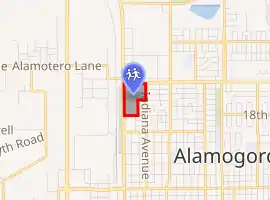 The main campus is located at 1900 North White Sands Boulevard in Alamogordo, New Mexico.[13] Most of the old buildings on the main campus have been razed since World War II. The oldest surviving building is the original Teachers' Cottage, built in 1918,[1]: 102 and renamed the Paul and Lois Tapia Building in 2006.[14] [15] Four of the campus buildings are listed in the National Register of Historic Places: the Administration Building (now the Paul and Lois Tapia Building), the Auditorium and Recreation Building (Harry Ditzler Auditorium), the Central Receiving Building, and the Infirmary Building.[16]