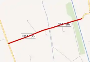 The highway begins at the junction with NM 28 south of Chamberino. The road heads east-northeast through pecan orchards and fields of Mesilla Valley and after approximately 0.7 miles crosses La Union Main Canal. At 1.05 miles (1.69 km) NM 186 passes by Anthony Country Club, then crosses the Rio Grande river over a 482.0-foot-long (146.9 m) bridge, built in 1957. NM 186 reaches its eastern terminus at intersection with FL 5872 (Levee Road) right after crossing the river.