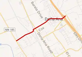 NM 320 (Thorpe Road) begins at a T intersection with NM 185, about 1.3 miles (2.1 km) southwest of Doña Ana and approximately 1,350 feet (410 m) east of the Rio Grande. (NM 185 heads north–northwesterly along the Rio Grande toward Radium Springs and Hatch. NM 185 heads southerly toward Las Cruces and Anthony.) From its western terminus, NM 320 heads northeast for about 0.3 miles (0.48 km) before connecting with the north end of Redfox Road (which immediately enters a small gated community), followed by the north end of Strange Road (County Road 37) and then the north end of Marigold Street.[2] After crossing the Leasburg Canal, NM 320 connects with the north end of Shenandoah Trail (street) and then has a jog of about 300 feet (91 m) to the north before resuming its northeastern course. Immediately after the jog, NM 320 connects with the south end of Giron Road (a dirt road), promptly crosses three sets of tracks for the BNSF Railway, and crosses Dona Ana Road (County Road 28). Roughly 0.4 miles (0.64 km) later NM 320 connects with the south end of Barela Road (County Road 40) and immediately enters the limits of the census-designated place of Doña Ana (about 1.3 miles [2.1 km] from the beginning of the highway).[2]