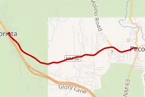 State Road 50 (NM 50) is a state highway in the US state of New Mexico. Its total length is approximately 6 miles (9.7 km). NM 50's western terminus is in the village of Glorieta at Interstate 25 (I-25), U.S. Route 84 (US 84) and US 85 and the eastern terminus is in the village of Pecos at NM 63 and NM 223.