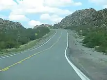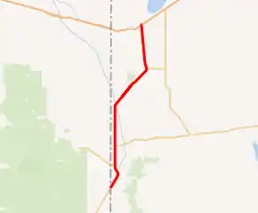 Despite being an even-numbered highway, NM 80 is signed as a north–south route.[12] This is because NM 80 takes its number from the now-defunct US 80, which was an east–west highway, as well as the fact that the highway continues as AZ 80 into Arizona.[11] NM 80 begins at the Arizona state line and eastern terminus of Arizona State Route 80. The highway travels northeast alongside the town of Rodeo.[12] On the north side of the highway is the now abandoned track bed of the former El Paso and Southwestern Railroad. On the northeast end of town at Shady Lane, Rivers Road curves off to the northeast. This is an older section of US 80 that used to lead to a railroad overpass, when the EP&SW was still operational. After the line was abandoned, US 80, now NM 80, was rerouted to a gentle curve bisecting the old track bed.[11] The old overpass has long since been demolished. NM 80 travels straight north from this point on.[12] 8 miles from the Arizona border, NM 80 intersects the eastern terminus of NM 533. Four miles north of NM 533 is the western terminus of NM 9, which heads east to Animas and Columbus.[13] Continuing north, NM 80 passes Rodeo Airport, then curves northeast, skirting the base of both Granite Peak and Blue Mountain.[12] At the eastern base of Blue Mountain is the western terminus of NM 143[13] NM 80 then makes a straight shot north through a desolate flat desert landscape until it reaches Roadforks. The small unincorporated area has a few service stations and small businesses for both NM 80 and I-10 travelers.[12] NM 80 continues for a few hundred feet north, before ending in a trumpet interchange at I-10 Exit 5.[1][12] While NM 80 ends here, US 80 would have continued east along much of the current route of I-10 to the Texas border.[11]