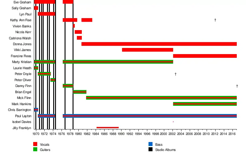 | Past members | Eve Graham Lyn Paul Marty Kristian Peter Doyle Peter Oliver Keith Potger Sally Graham Laurie Heath Chris Barrington Kathy Ann Rae Nicola Kerr Danny Finn Caitriona Walsh Vikki James Brian Engel Vivien Banks Isobel Davies Jilly Franklyn |