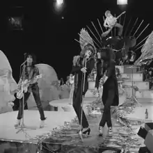 After the album's release, the Dolls toured the US as a supporting act for English rock band Mott the Hoople. Reviews complimented their songwriting, Thunders and Sylvain's guitar interplay, and noted their campy fashion and the resemblance of Johansen and Thunders to Mick Jagger and Keith Richards. However, some critics panned them as an unserious group of amateurs who could not play or sing.[48] During their appearance on The Old Grey Whistle Test in England, the show's host Bob Harris dismissed their music as "mock rock" in his on-air comments.[49] They also developed a reputation for rock-star excesses, including drugs, groupies, trashed hotel rooms, and public disturbances, and according to Ben Edmonds of Creem, became "the most walked-out-on band in the history of show business".[50] Strongman wrote that the band and the album were difficult to market because of their kitschy style and how Murcia's death had exacerbated their association with hard drugs, which "wasn't altogether true in the early days".[51] They remained the most popular band in New York City, where their Halloween night concert at the Waldorf Astoria in 1973 drew hundreds of young fans and local television coverage.[52]