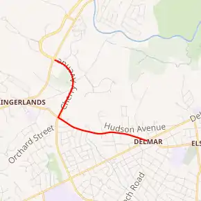 The Kenwood Avenue portion of the route heads generally eastward through mostly residential neighborhoods. After 1 mile (1.6 km), it enters the hamlet of Delmar, a large community built up along NY 443. In Delmar, the route passes through areas of more commercial nature before terminating at an intersection with NY 443. The junction is located just 0.5 miles (0.8 km) from the northern terminus of NY 335, which ends at another junction with NY 443 in nearby Elsmere.[4]