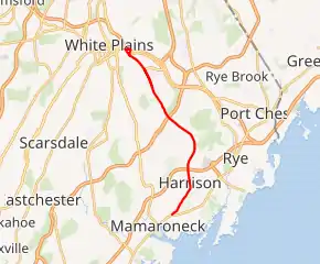 New York State Route 127 (NY 127) is a 6.36-mile (10.24 km) north–south state highway in Westchester County, New York, in the United States. It begins at an intersection with U.S. Route 1 in the village of Mamaroneck and ends at an interchange with I-287 in the city of White Plains. The route also connects to the Hutchinson River Parkway in the town of Harrison. NY 127 was assigned as part of the 1930 renumbering of state highways in New York; however, parts of the road had been state-maintained since the 1910s. Within White Plains, NY 127 is maintained by Westchester County as County Route 30 (CR 30). The concurrent county route designation is unsigned, as are all county routes in Westchester County.