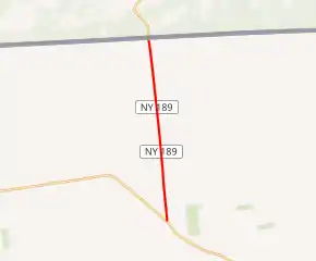 The route's second and last intersection in Churubusco is with Broad Street, which links NY 189 to the more populated eastern half of the hamlet. North of Churubusco, NY 189 passes through more forests and fields and serves only a small amount of isolated residences and farms. As it heads toward the Canada–US border, it crosses roads of mostly local importance, beginning with Merchia Road just north of Churubusco and concluding with CR 9 (Frontier Road) and Liberty Pole Road at a junction less than 1 mile (1.6 km) from the border. NY 189 continues north to the border, where it ends upon passing the Churubusco–Franklin Centre Border Crossing. Past the station, the highway continues north into the Canadian province of Quebec as Route 209.[3]