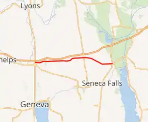 | Ontario | Town of Phelps | 0.00 | 0.00 | Western terminus; exit 42 (I-90 / Thruway) | |