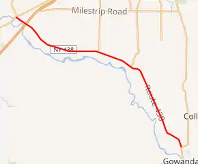 NY 438 begins at an intersection with US 62 and NY 39 in northern Gowanda. The route heads north, inheriting the Buffalo Street moniker from US 62 and NY 39, which turn east at NY 438's southern terminus. Outside of the village in Collins, the route becomes Four Mile Level Road as it curves westward into the Cattaraugus Indian Reservation.[4] As its name implies, the route traverses relatively level terrain for a stretch of roughly 4 miles (6 km) as it parallels the northern bank of Cattaraugus Creek to the northwest and west.[5][6] During this stretch, NY 438 intersects both Versailles–Plank Road and Brant Road (southern terminus of County Route 9 or CR 9) and crosses over the narrow Clear Creek.[4]