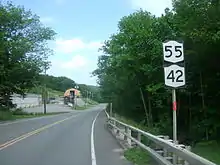 Signage along NY 55 in Curry with a reassurance marker for NY 42, giving the false impression that an overlap still exists between the two routes