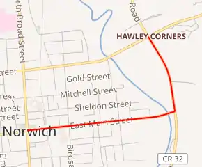 Design plans for all of Norwich's arterial highways, including East Main Street, called for the roads to be widened to 36 feet (11 m), an increase of up to 8 feet (2.4 m) in some locations. Additionally, in the vicinity of the Chenango River, East Main Street would be realigned slightly to take a northeasterly track across a new bridge over the river. As a result, the reconfigured East Main Street would meet East River Road at a point slightly north of the existing intersection between the two highways. The total cost of reconstructing East River Road, Broad Street, and Main Street was estimated at $952,800 (equivalent to $9.61 million in 2022), of which all but $3,350 would be paid for by the state.[8] Work began in October 1954 with a $250,000 project (equivalent to $2.52 million in 2022) rebuilding the part of North Broad Street[10][12] between Mitchell Street and the northern city line. It was completed in 1955.[13][14]