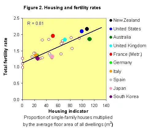 Studies have shown that fertility is highest among couples living in single-family houses and lowest among those residing in apartments.[12] Experts claim that shortages of family housing can cause low birth rates. “Some have suggested that, like laboratory specimens, Italians have responded to their ever-more-crowded-suburbs and cramped apartments by curbing procreation”.[13] Children “aren't wanted in the condominia (apartments), in public places where they can disturb”.[13] “Houses are bigger in the U.S. and generally more available. That may help explain why Americans have more babies”.[14]