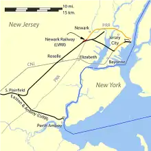 The Newark Railway was incorporated on December 10, 1890, and was a short, 1-mile connection between the Lehigh Valley Railroad's Newark and Roselle Railway and the Pennsylvania Railroad (PRR). Upon completion on Feb 16, 1891, all passenger traffic, which had previously been routed to the PRR at Metuchen, instead took the route from South Plainfield to Newark, where it connected with the PRR and continued to the PRR station in Jersey City. The Newark Railway also served a LVRR freight and coal depot at Pennsylvania Avenue, adjacent to the PRR junction.