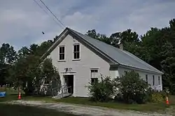 The Newbury Town House is located near the geographic center of Newbury, in a rural setting on the east side of Scotch Hollow Road, roughly midway between its junctions with Fish Pond Road and Halls Lake Road. It is set back from the road, between two cemetery parcels. It is a fairly plain single-story wood-frame structure, with a gabled roof, clapboarded exterior, and stone foundation. The principal adornment on the exterior is its entrance surround, which consists of pilasters rising to bullseye blocks and a header with a protruding central pyramidal section flanked by paneled blocks. The pilasters are decorated with early Greek Revival fretwork. The interior of the hall retains original pew-like benches, and rustic horizontal board wainscoting.[2]