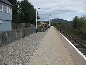 Newtonmore railway station serves the village of Newtonmore, Highland, Scotland. The station is managed by ScotRail and is on the Highland Main Line. The station is 68 miles 62 chains (110.7 km) from Perth, between Dalwhinnie and Kingussie, and has a single platform which is long enough for a ten-coach train.[3] It is currently the only station on the Highland Main Line to have one platform, although the former second platform can still be seen adjacent to the first platform.[3]